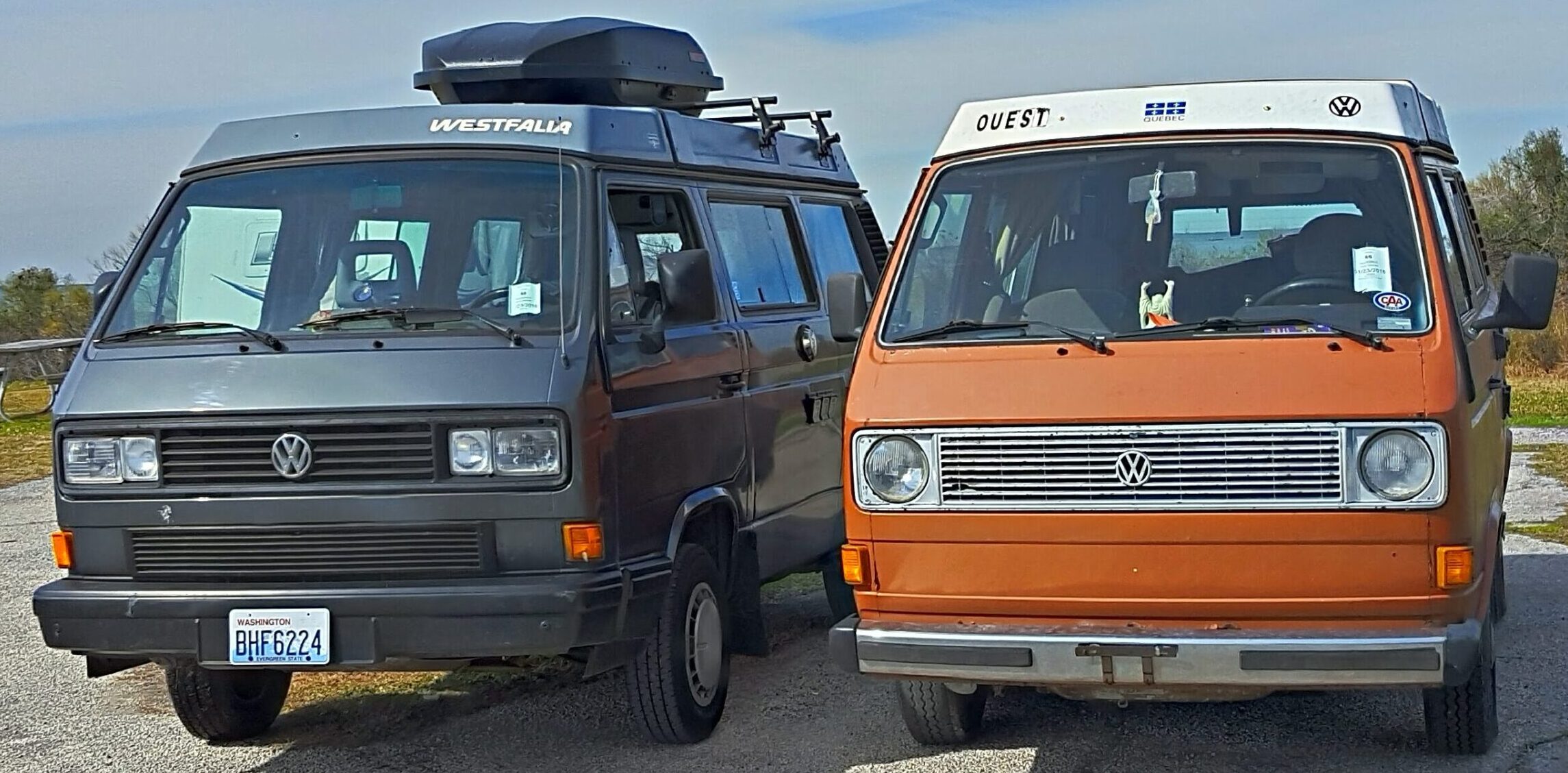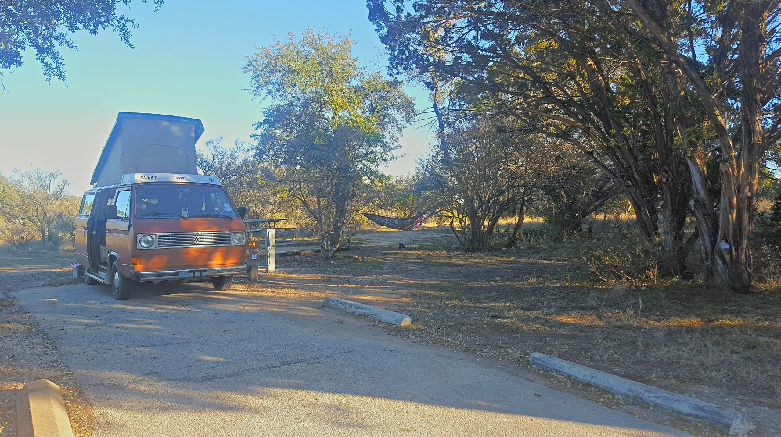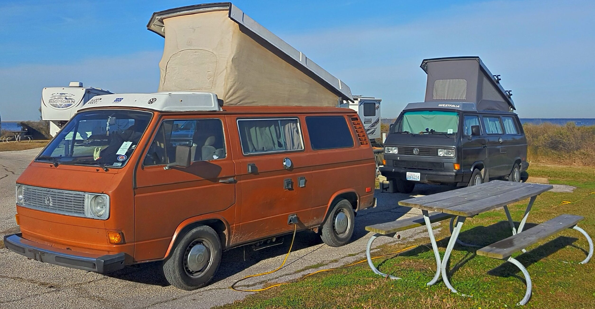 En direction vers le parc de Glaveston Island, un Westfalia nous dépasse sur la route et nous nous faisons un échange de signe de peace enjoué. Quelques minutes plus tard, on se retrouve dans le stationnement du parc et on décide de partager le même site de camping.