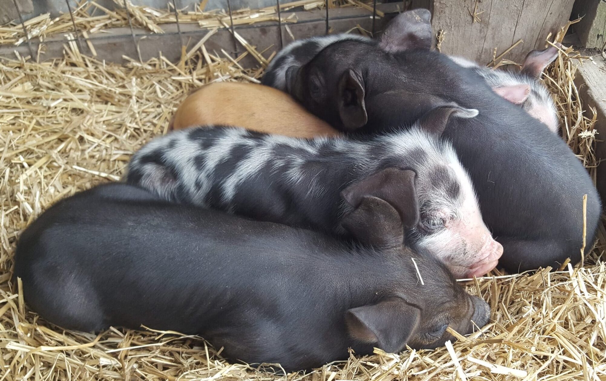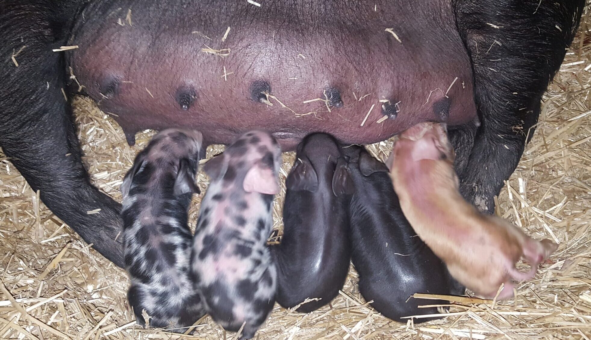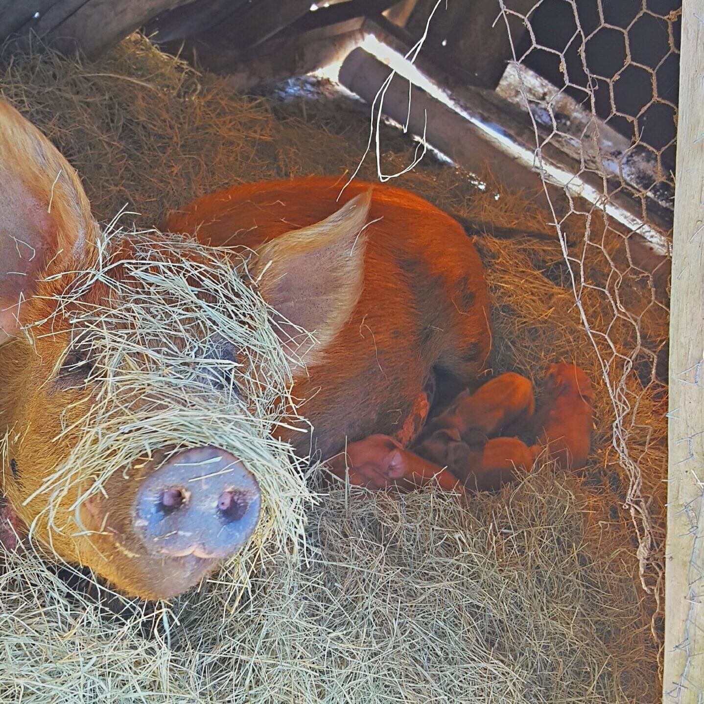 De plus, nous avons eu l’immense chance et privilège de passer une soirée (de 20h à 2h du matin) dans le foin avec une truie qui a accouché de cinq magnifiques petits porcelets.