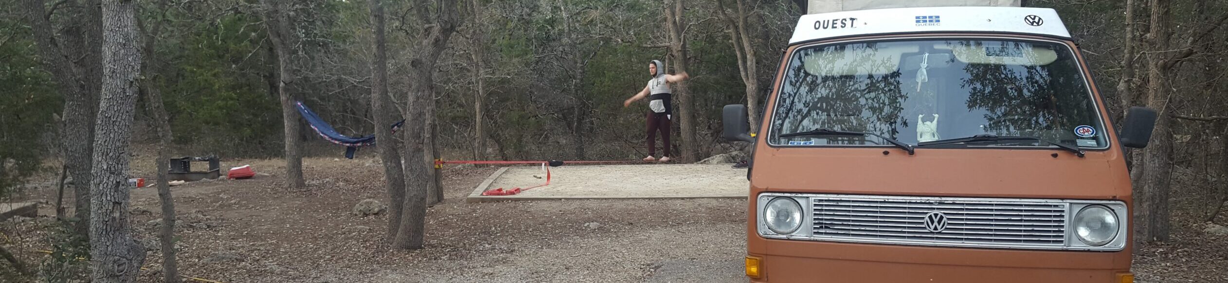Finalement on trouve un foodtruck et on couche dans un Walmart où l’on dort très mal. Le lendemain on fait le tour du Lady Bird Lake, on fait du slackline et on continue notre chemin. On sait qu’on manque plein de choses, mais on a le gout du calme de la nature dans un camping.